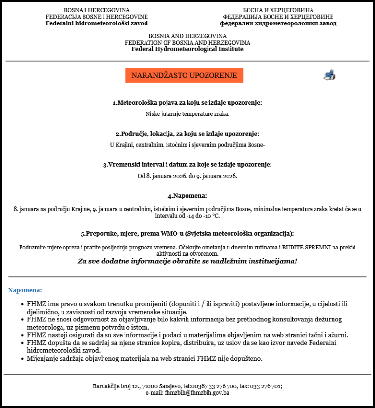 Federalni hidrometeorološki zavod izdao je NARANDŽASTO upozorenje za niske jutarnje temperature zraka.